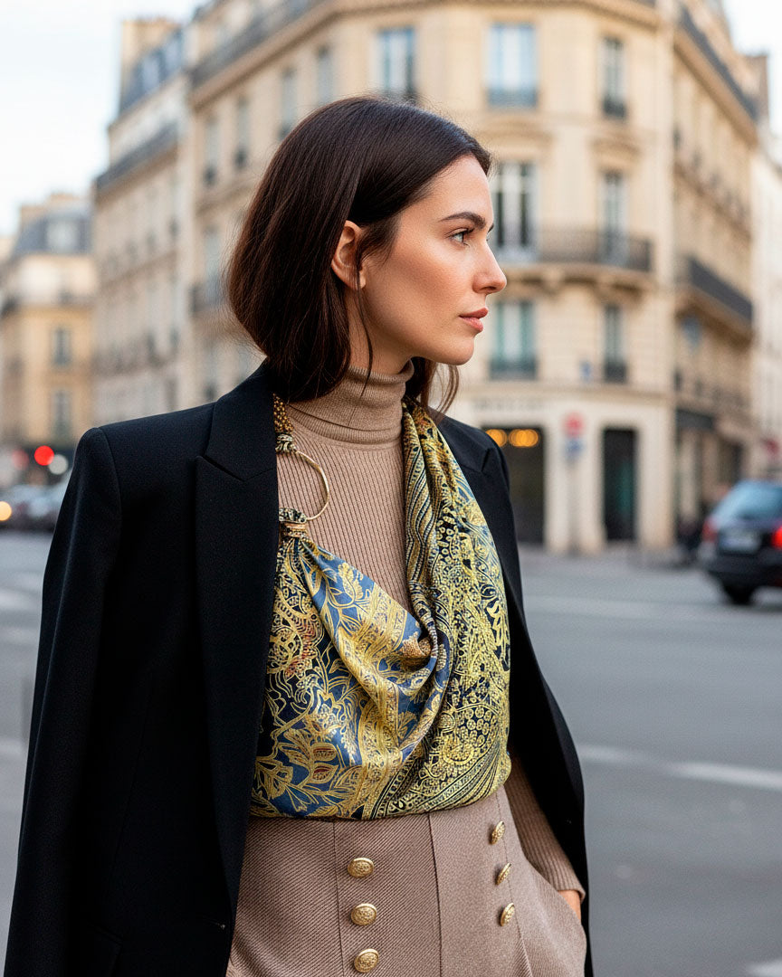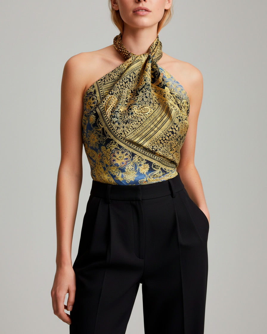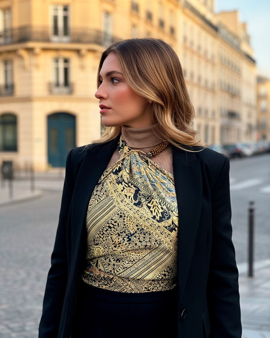 Kapri de seda con fondo en colores negros y dorados, una pieza versátil que puedes usar como top, bandana, cinturón o asa de bolso. Su estampado de inspiración acuarela, con pinceladas fluidas y detalles dorados, lo convierte en un accesorio fresco y sofisticado.