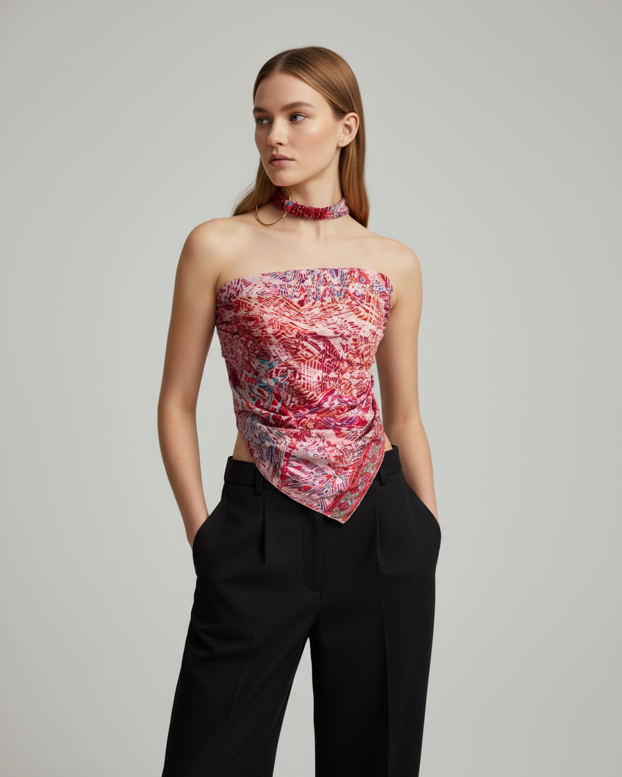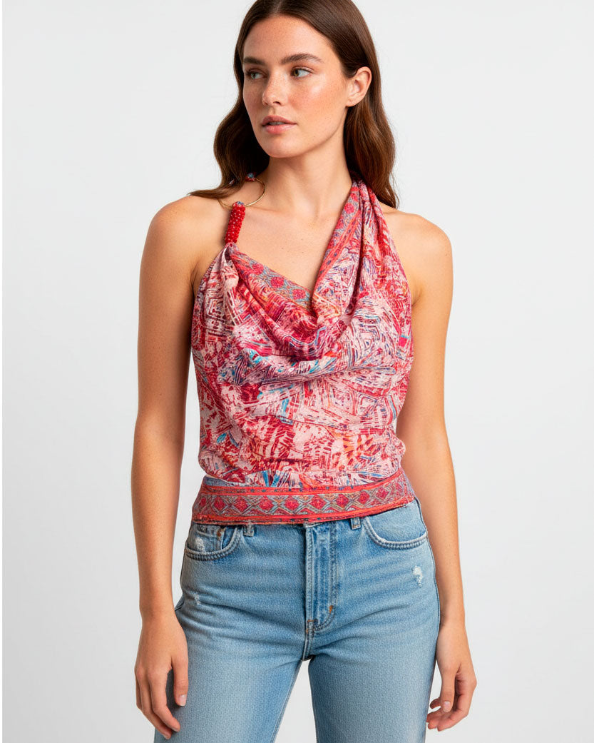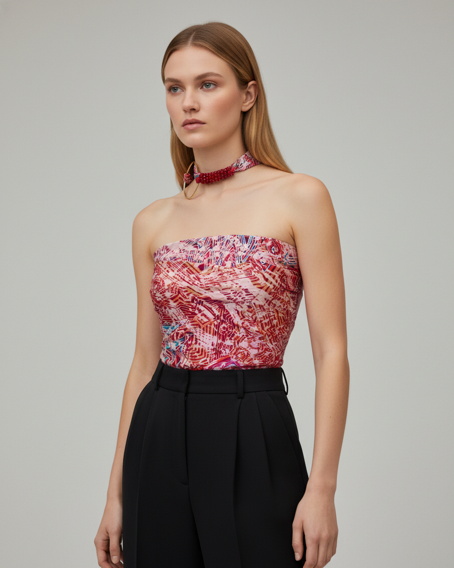Kapri de seda con fondo en color rojo, una pieza versátil que puedes usar como top, bandana, cinturón o asa de bolso. Su estampado de inspiración acuarela, con pinceladas fluidas y detalles dorados, lo convierte en un accesorio fresco y sofisticado.
