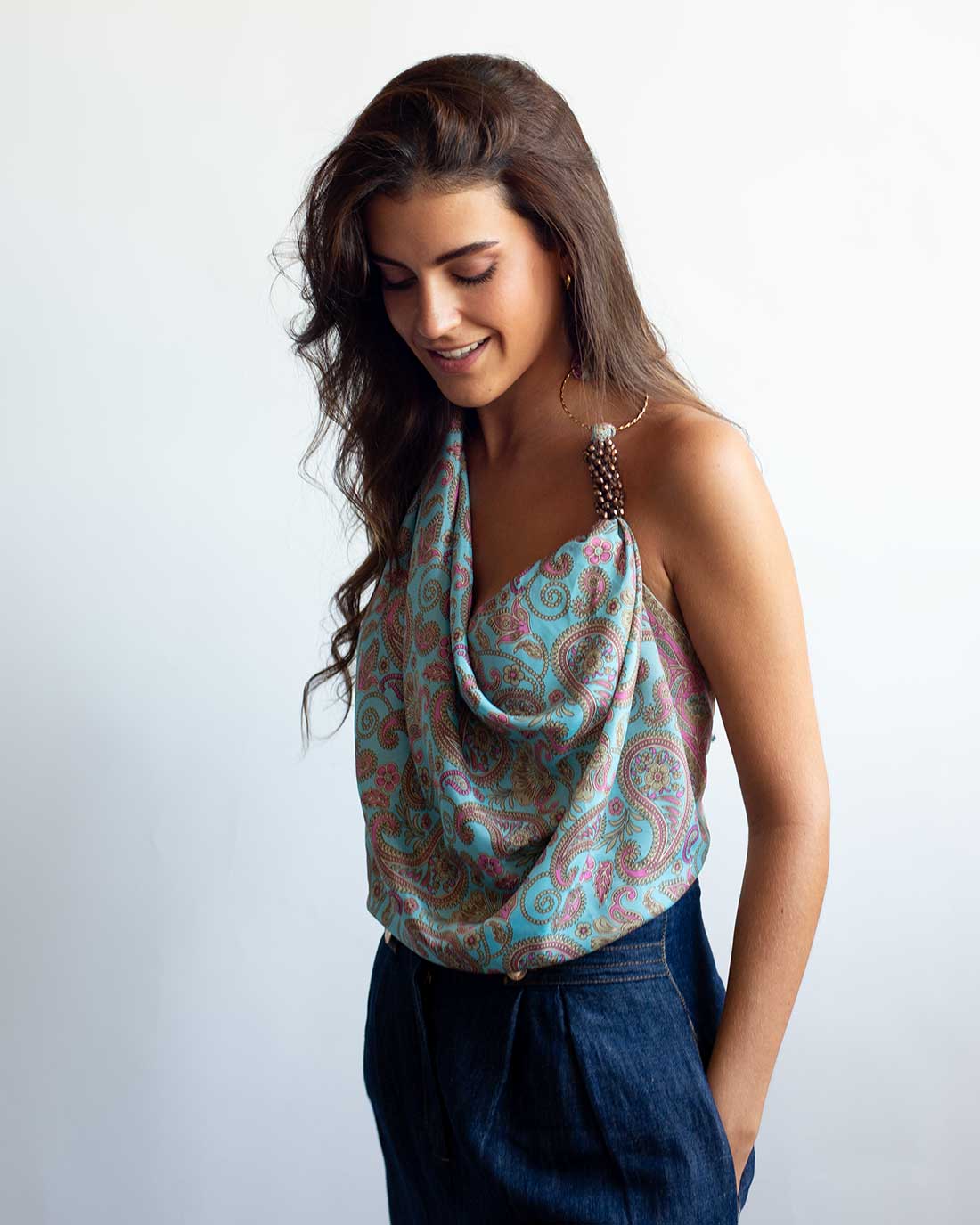 Kapri de seda con fondo en colores turquesas y rosas, una pieza versátil que puedes usar como top, bandana, cinturón o asa de bolso. Su estampado de inspiración acuarela, con pinceladas fluidas y detalles dorados, lo convierte en un accesorio fresco y sofisticado.