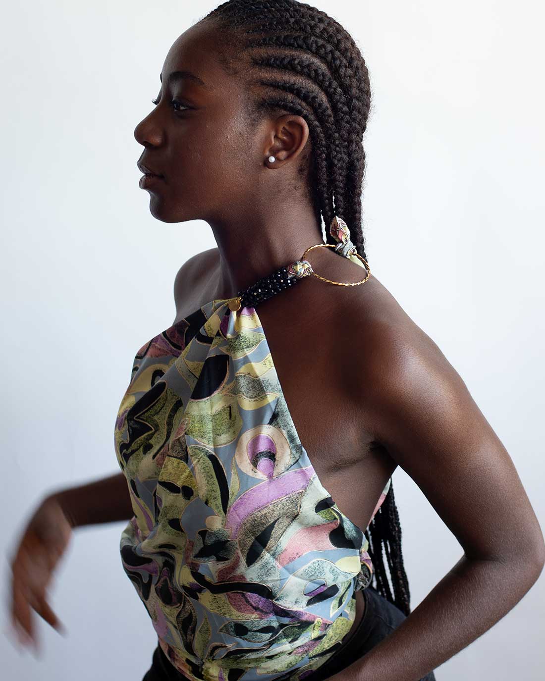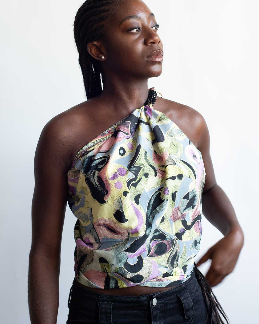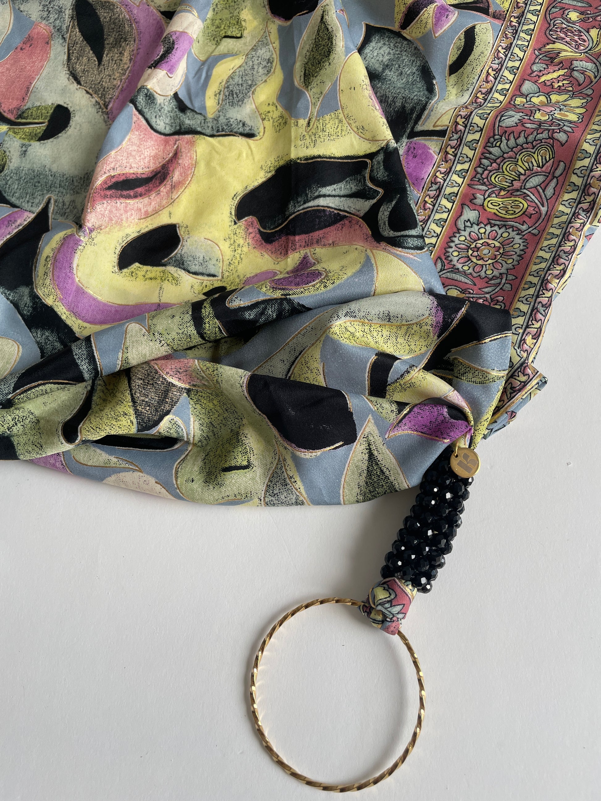 Kapri de seda con fondo negro, una pieza versátil que puedes usar como top, bandana, cinturón o asa de bolso. Su estampado de inspiración acuarela, con pinceladas fluidas y detalles dorados, lo convierte en un accesorio fresco y sofisticado.