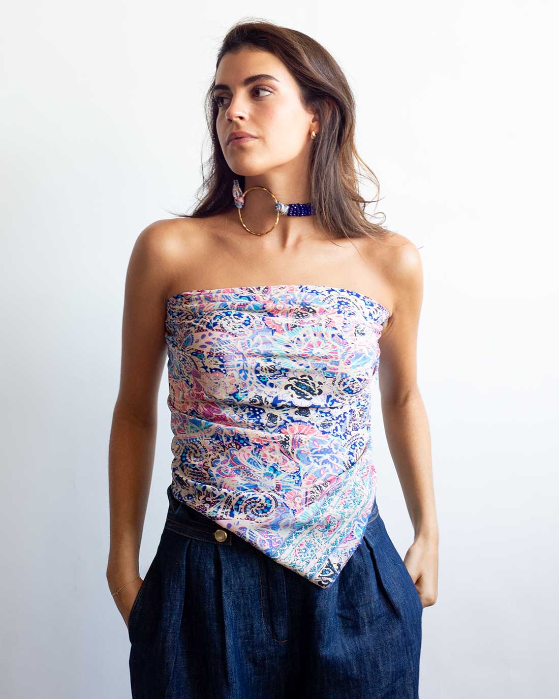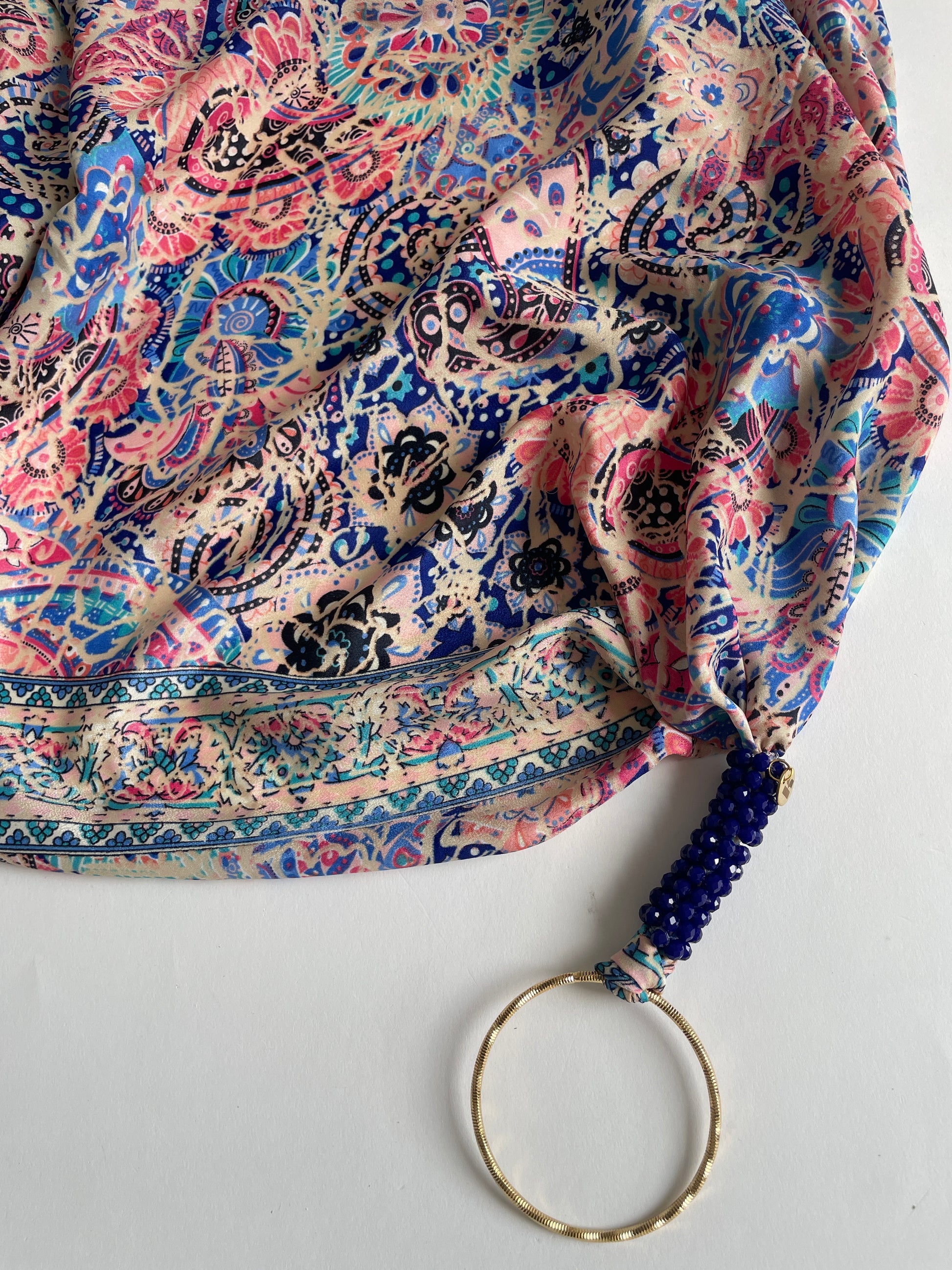 Kapri de seda con fondo en colores corales, una pieza versátil que puedes usar como top, bandana, cinturón o asa de bolso. Su estampado de inspiración acuarela, con pinceladas fluidas y detalles dorados, lo convierte en un accesorio fresco y sofisticado.