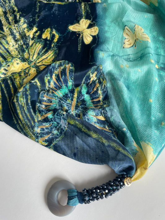 Kapri de seda con fondo en colores verdes claros y beige, una pieza versátil que puedes usar como top, bandana, cinturón o asa de bolso. Su estampado de inspiración acuarela, con pinceladas fluidas y detalles dorados, lo convierte en un accesorio fresco y sofisticado.