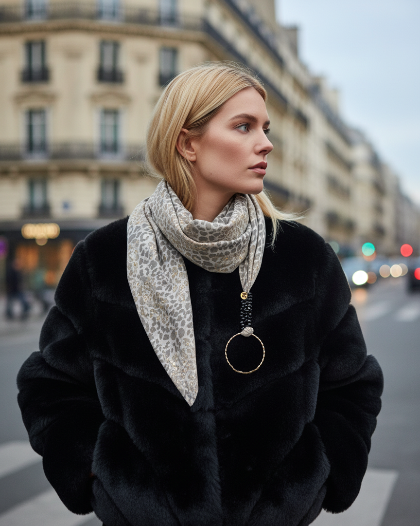 Kapri de seda con fondo de manchas en colores grises y negros con detalles de brillos dorados, una pieza versátil que puedes usar como top, bandana, cinturón o asa de bolso.