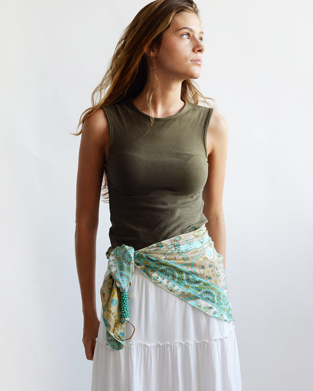 Kapri de seda en tonos turquesa y crema, una pieza versátil que puedes usar como top, bandana, cinturón o asa de bolso. Su estampado de inspiración acuarela, con pinceladas fluidas y detalles dorados, lo convierte en un accesorio fresco y sofisticado.